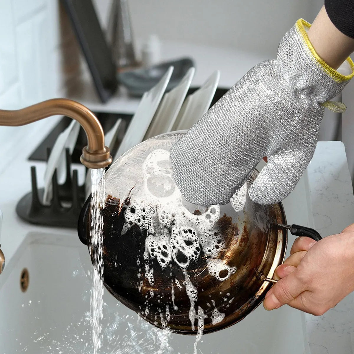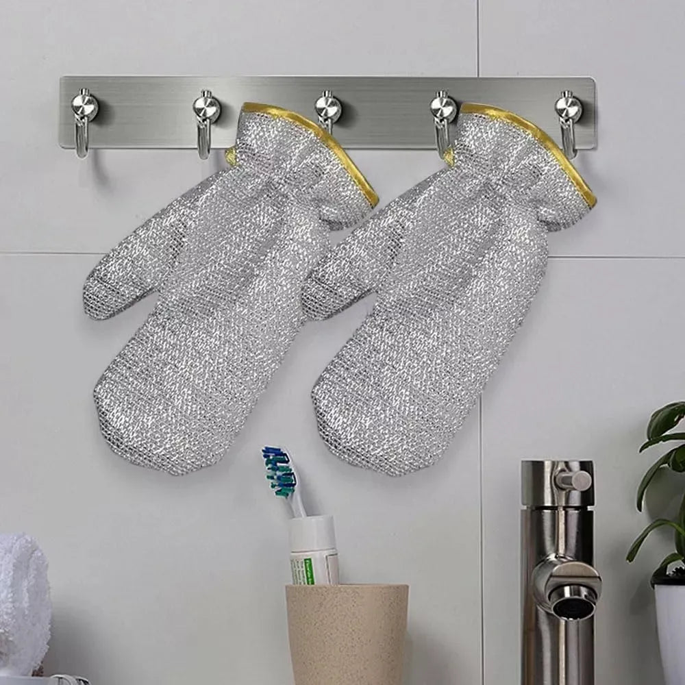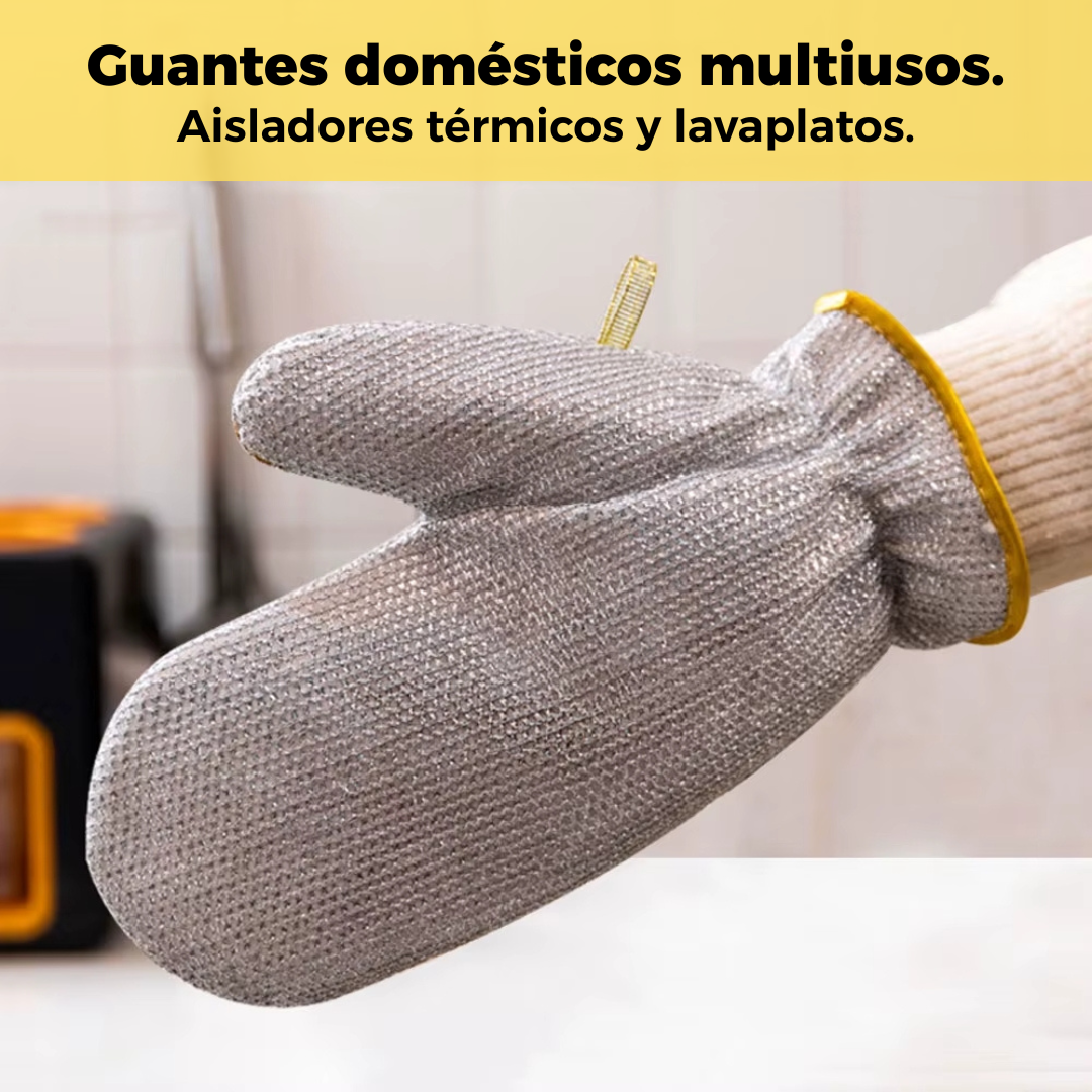 Guantes de alambre de acero con interior de PVC y banda elástica que ofrecen limpieza profunda y protección total. Ideales para lavar platos y utensilios del hogar, combinan malla metálica para descontaminación efectiva con fibra suave de alta absorción para una experiencia cómoda y segura.